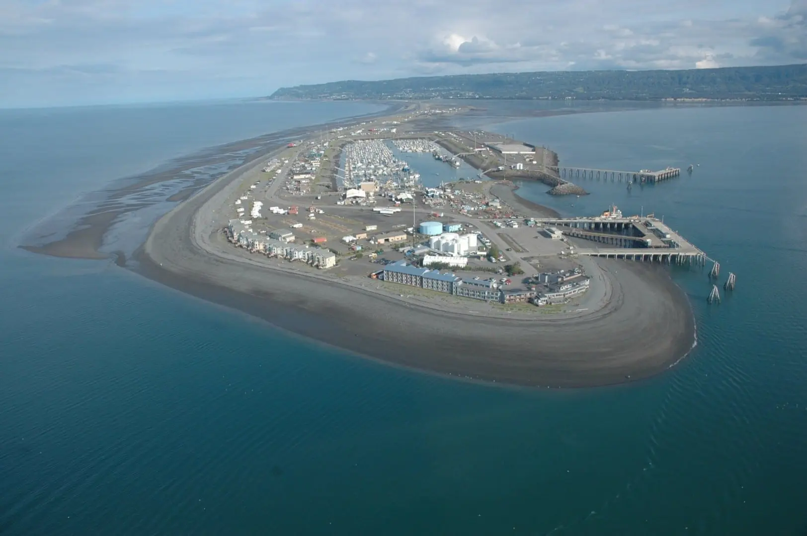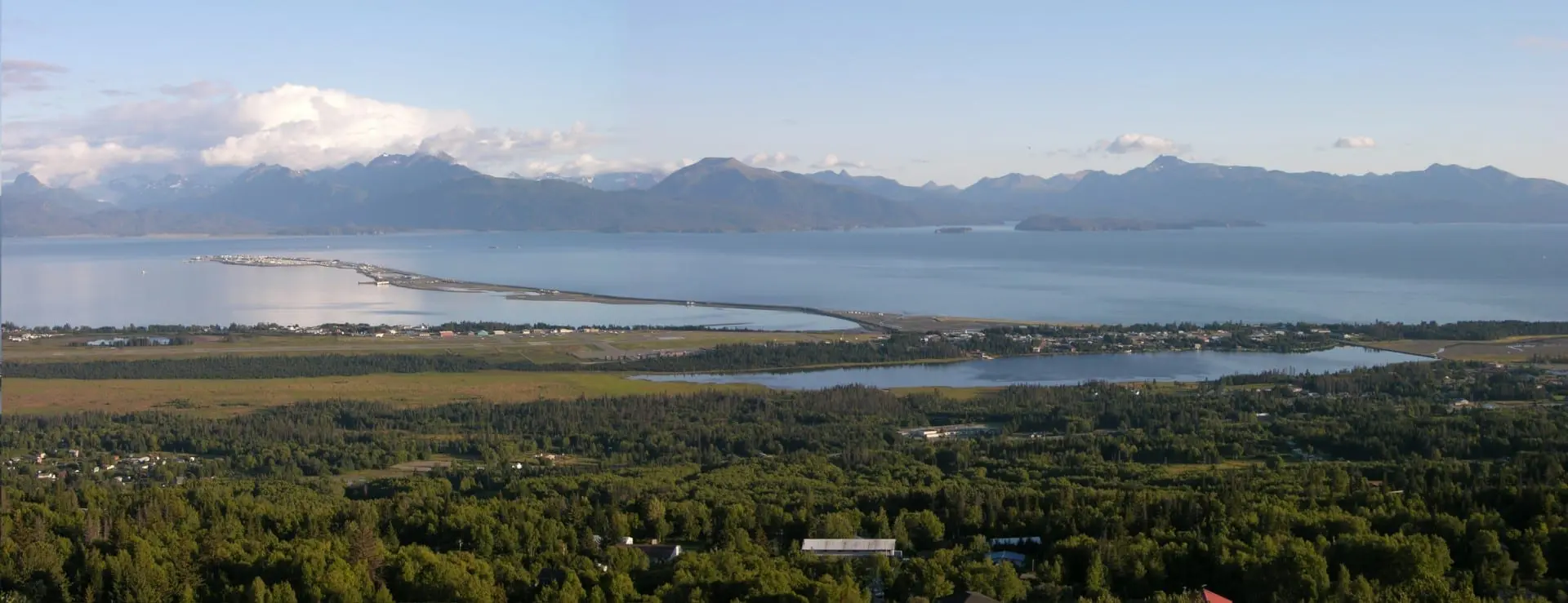 Allí la carretera (AK 1) gira al sureste y termina en la punta del Homer Spit, un banco de arena natural que se extiende unas cuatro millas hasta la bahía de Kachemak, en el parque End of the Road.
