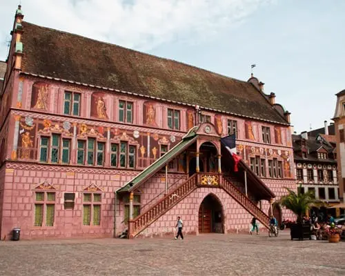Place de la Réunion. La plaza principal del casco antiguo de Mulhouse. Entre los principales edificios se encuentran el Templo (Iglesia Protestante) de St. Etienne, popularmente conocido como la «catedral», y el antiguo ayuntamiento. El Templo fue construido en el siglo XIX, aunque parece mucho más antiguo, e incorpora vitrales y mobiliario del edificio medieval que reemplazó. El antiguo ayuntamiento, que actualmente alberga el Museo Histórico de la ciudad, destaca por su elaborada decoración pintada en trampantojo de mármol.