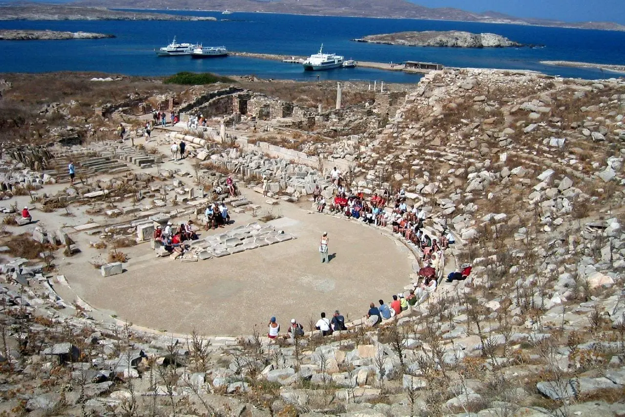 Delos, una pequeña isla deshabitada cerca de Mykonos, es un área de patrimonio mundial de la UNESCO conocida por sus importantes sitios arqueológicos. Hay excursiones diarias desde la ciudad de Mykonos excepto el lunes, cuando el sitio arqueológico está cerrado. Se organizan viajes en barco a Delos desde Platys Gialos y Paranga Beach.