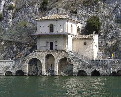 Santa Maria dell’Annunziata o Madonna del Lago, construida en el 1700, está construida en la roca al lado del lago, con la carretera que pasa por debajo.
