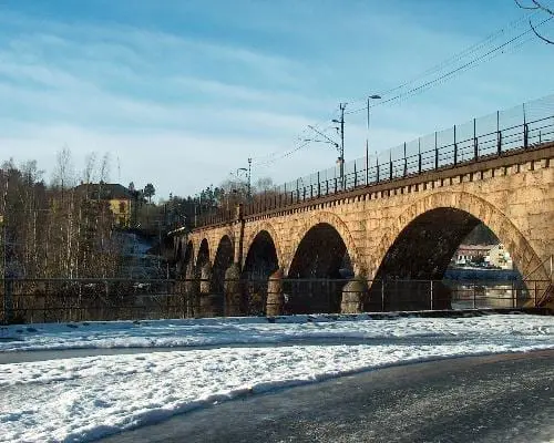 La cascada en el centro de la ciudad no es muy impresionante si has visto una cascada antes. Podría oler un poco raro ya que el río fluye a través de una fábrica de papel no muy lejos de la ciudad. Pero si tienes la oportunidad de verla en un día soleado cuando la presa está abierta, tiene su encanto. También hay un parque cerca, el parque Nordre («El parque del norte»), donde puedes sentarte, relajarte y disfrutar de la vista de la cascada.