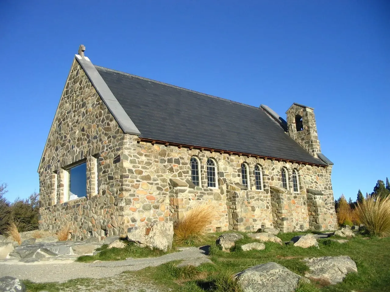 Iglesia del Buen Pastor y la estatua del perro pastor. La iglesia está a la orilla del lago y tiene una vista increíble del lago. Está abierta durante el día. Cerca de ella hay una estatua de bronce de un perro collie, en honor a los perros pastores de los que dependen los granjeros de ovejas.
