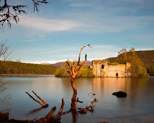 Loch an Eilein y Castle. Un lago en el bosque de Rothiemurchus con un castillo en ruinas en una isla. En Walkhighlands se describe un paseo de 7 km alrededor del lago.