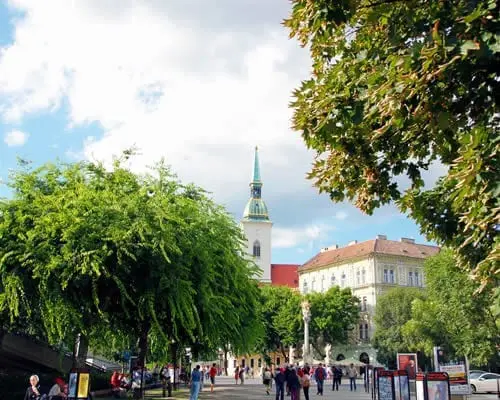 Demos un paseo por el centro de la ciudad. Bratislava tiene uno de los centros históricos más pequeños de los alrededores, pero el encanto está más concentrado. Las calles han sido completamente renovadas en los últimos diez años, trayendo vida de nuevo aquí. Desde entonces se han abierto aquí multitud de cafés, bares y restaurantes de todo tipo, acompañados de algunas tiendas de recuerdos y de moda. En los días cálidos, casi todos los cafés tienen una sección de asientos al aire libre en la calle, bulliciosos y que dan a la ciudad una sensación acogedora única.
