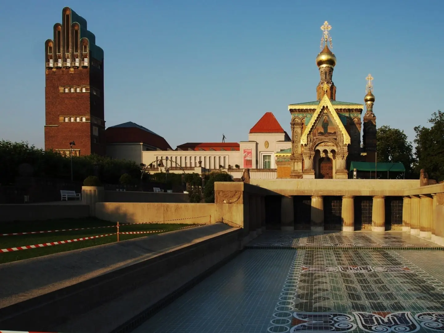 Künstlerkolonie Mathildenhöhe. para ver los más interesantes. Esta es la parte más hermosa de Darmstadt. También hay un pequeño parque, un museo de arte y una capilla de estilo ruso. En 1899 el Gran Duque Ernst Ludwig invitó a siete artistas a venir a Darmstadt y así se fundó la Colonia de Artistas Mathildenhöhe. La primera de cuatro grandes exposiciones de arte tuvo lugar en 1901. Los artistas presentaron sus ideas de un nuevo mundo de vida y trabajo. Diseñaron una colonia, cuyo punto focal es la Casa Estudio, la Casa Ernst Ludwig. Desde 1990 alberga el Museo de la Colonia de Artistas.